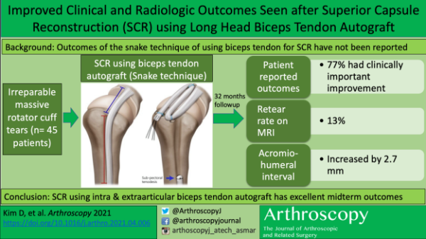 Resultados clínicos y radiológicos mejorados después de la reconstrucción de la cápsula superior con autoinjerto del tendón del bíceps de cabeza larga El objetivo de este estudio fue investigar los resultados clínicos y radiológicos después de la reconstrucción de la cápsula superior (SCR) con el tendón del bíceps (BT) para desgarros irreparables del manguito rotador.