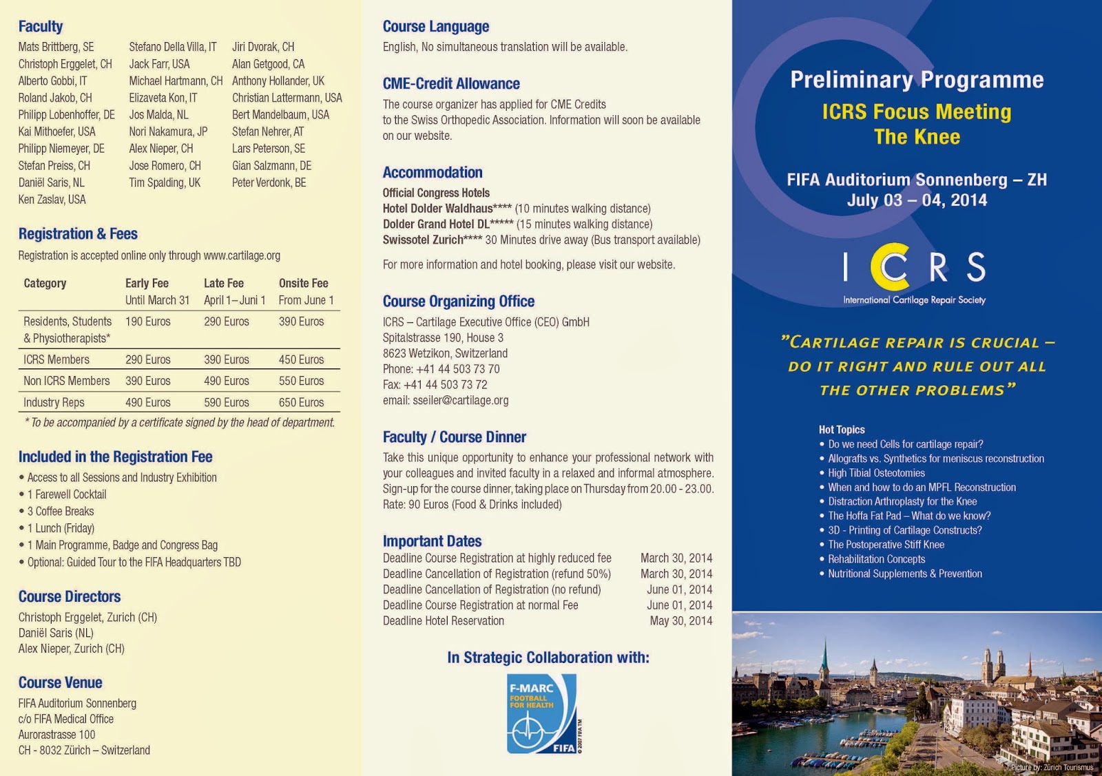 How many of our patients and athletes are not satisfied with the result of our treatments?! There is still room for improvement. Maybe the smaller things make the difference? Are there pathologies we have overlooked? The ICRS Focus Meeting – The KNEE – will showcase an update on the standard procedures and highlight a topics and approaches off the beaten path – critically presented and discussed by a world class faculty. Elite athletes will discuss the implications of knee problems for their career. The very personal atmosphere of the FIFA Auditorium Sonnenberg in Zurich enables vivid discussions, direct networking and support for specific cases. Industry representatives will demonstrate the latest developments in the field.